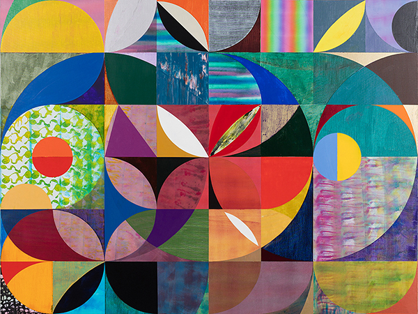 [vc_row][vc_column width=”1/6″][/vc_column][vc_column width=”2/3″][vc_column_text]Por Valesca Veiga[/vc_column_text][vc_empty_space][vc_column_text]A nova exposição individual de Luiz Zerbini deflagra algumas questões fundamentais da pesquisa pictórica do artista esquadrinhada e expandida ao longo de mais de três décadas. Sete telas em grande formato, dispostas nas amplas paredes da galeria Carpintaria, apresentam composições geométricas abstratas que irradiam exuberância cromática. Camadas e sobreposições por tramas de transparências e opacidades, frequentes em todo o tecido poético de Zerbini, estão construídas como uma rede de texturas de sutileza fina que dialogam com a visualidade de outras técnicas, como a estampagem serigráfica, a gravura e a fotografia. O efeito de colagem entre os diversos planos, recorrente nas composições figurativas do artista, está aqui revisitado pela construção da cor, que apesar de fragmentada pela extensa paleta, é o elemento agregador do todo poético. Tudo parece estar sincronizado.