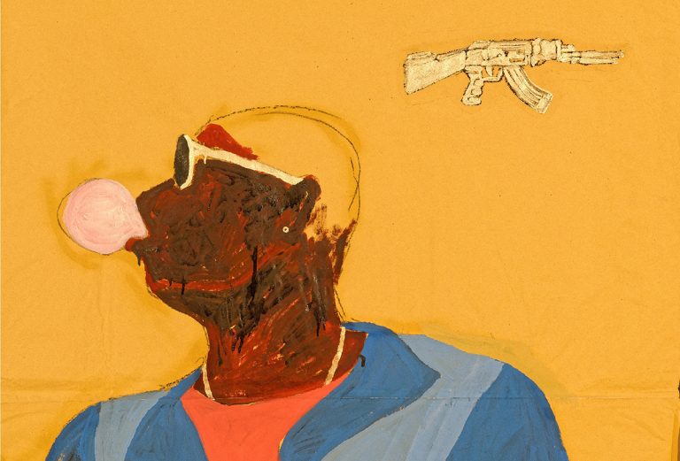 O extenso campo pictórico das folhas pardas de Maxwell reserva também um lugar para a música, associada a essa consolidação de identidade. A relação se dá através de imbricações das propriedades picturais e musicais pela via do rap, gênero marcado pelo preciosismo do pop, sempre em busca de hits. Assim como na produção de uma faixa de rap, onde os músicos acionam inúmeros elementos e fazem arranjos infalíveis que inflamam as plateias, Maxwell manipula muitas partes do desenho, e sempre atinge um equilíbrio preciso no todo de sua composição, pondo o espectador em movimento. O artista transpôs para a pintura as canções dos rappers BK, Baco Exu do Blues e Djonga, abrindo um fluxo entre as pontas de cada manifestação artística.